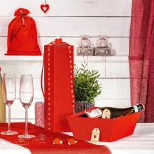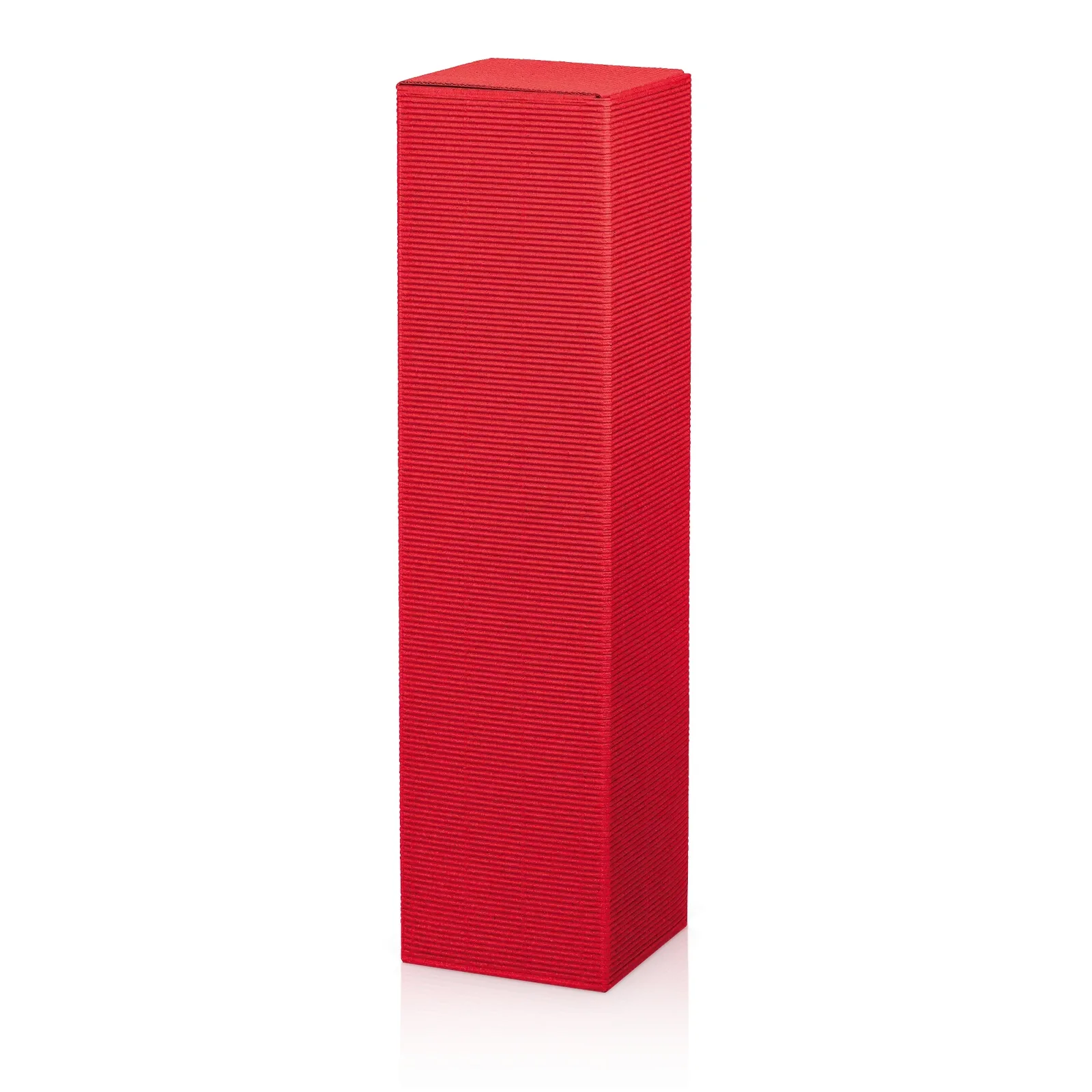 Ležatý kartón vyrobený z lepenky červenej farby na 1 flašu. Otváranie je na vrchu kartónu. Povrch kartónu je vrúbkovaný.