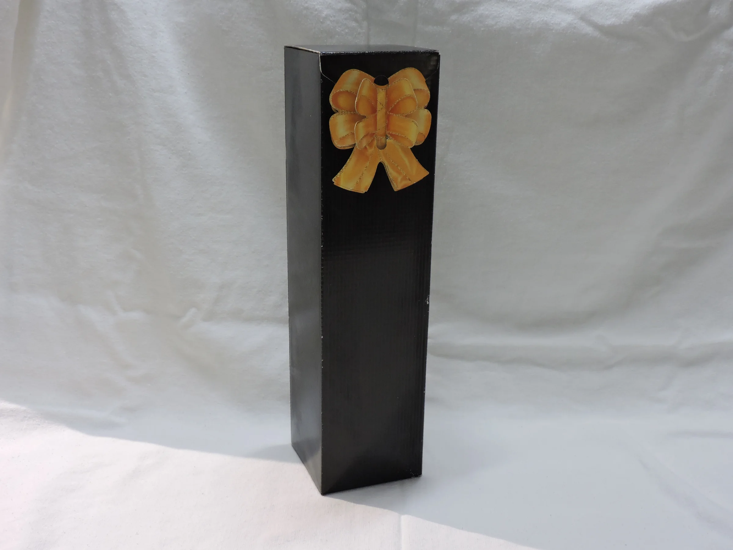 Ležatý kartón vyrobený z lepenky čiernej farby s mašlou na 1 flašu.