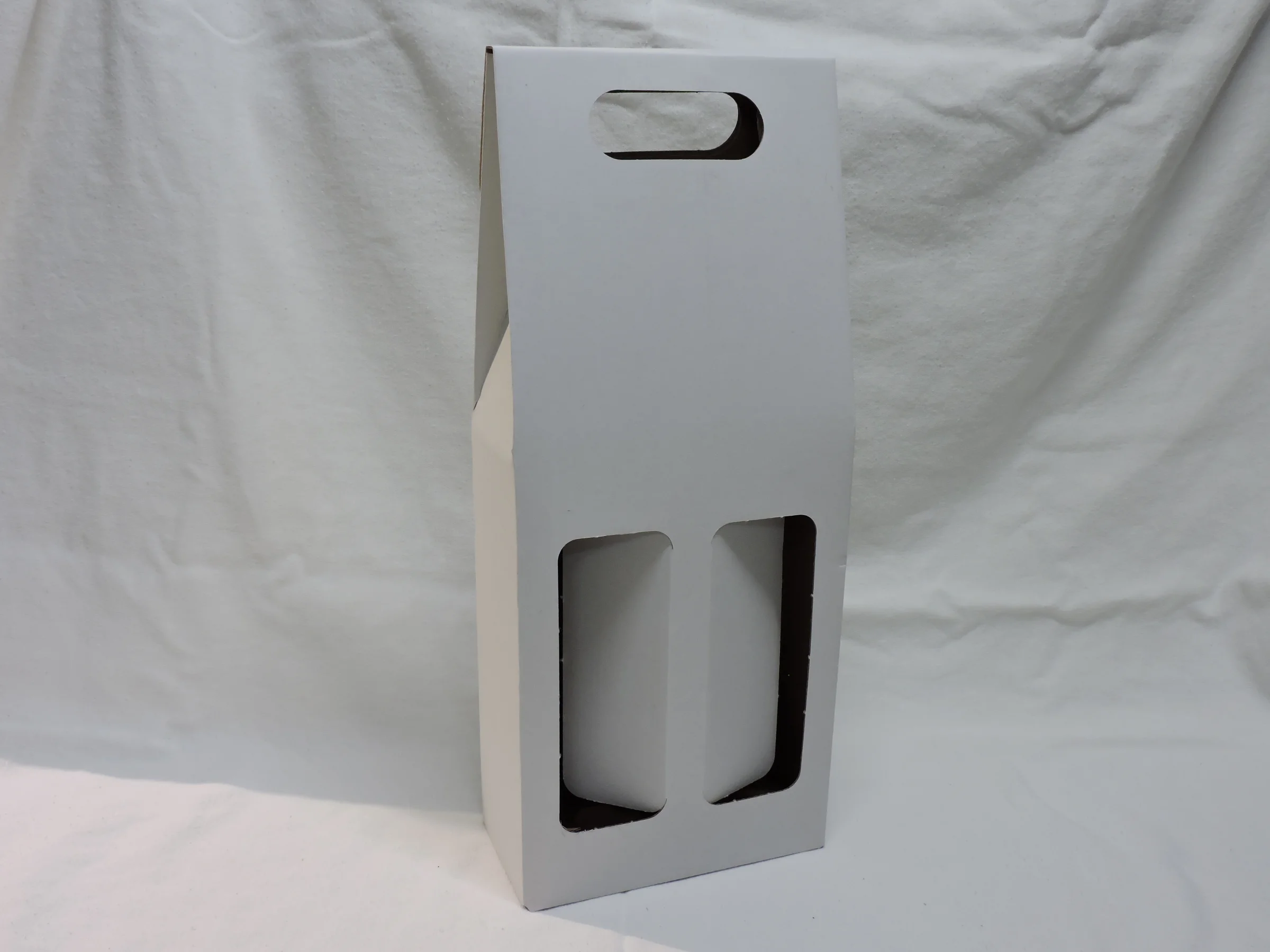 Obaľ na 2fl vína z trojvrstvovej vlnitej lepenky bielej farby.