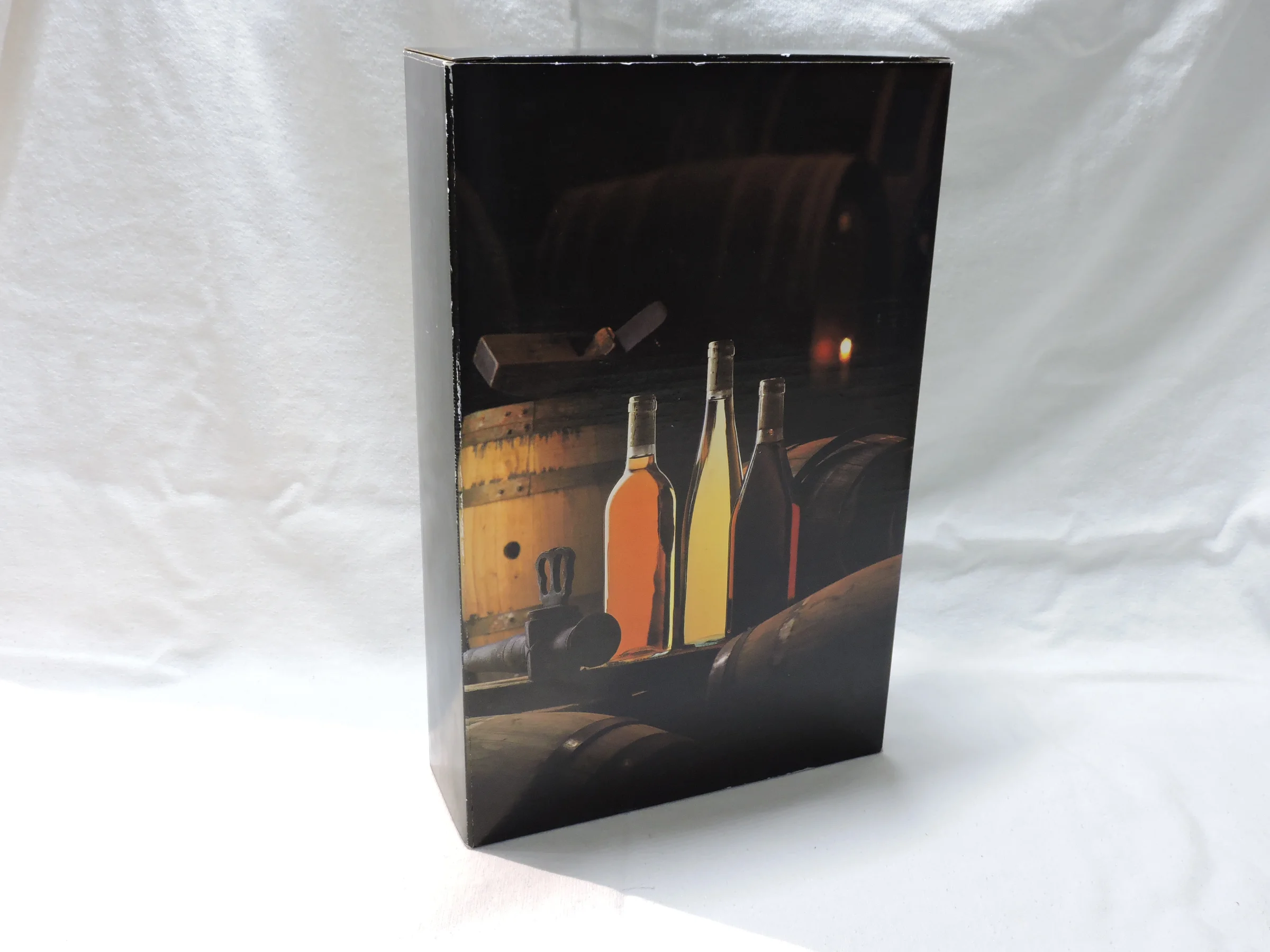 Ležatý kartón vyrobený z lepenky bordovej farby na 3 flaše. Povrch kartónu je vrúbkovaný.
