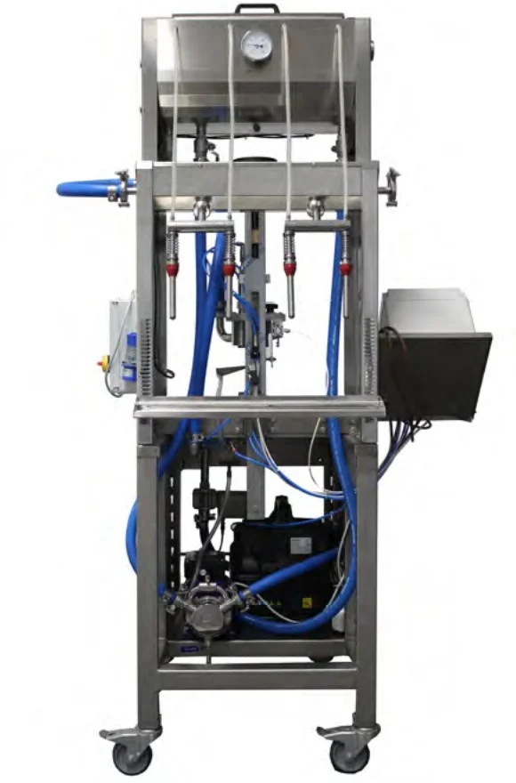 Plnička bag in box: poloautomatický model BB20 s indukčným prietokomerom z nehrdzavejúcej ocele. Systém plnenia bez gravitácie. Objemové čerpadlo s výkonom 1,1 kW s flexibilným obežným kolesom z EPDM. PLC pre nastavenie cyklu, parametrov a čistenia. Vákuum a vstrekovanie dusíka sú súčasťou cyklu. Tlmiaci vzduchový kompresor.