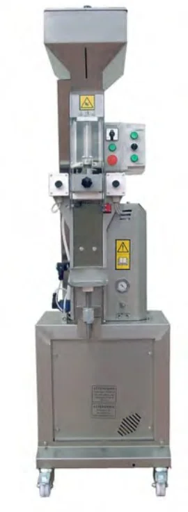 Motorizovaný uzatvárací stroj s automatickým násypníkom a podávačom na vkladanie korkov do fliaš.