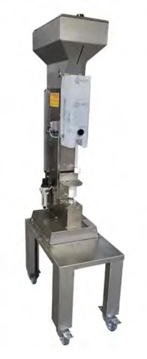 Pneumatický uzatvárací stroj s automatickým násypníkom na vkladanie korkov do fliaš.