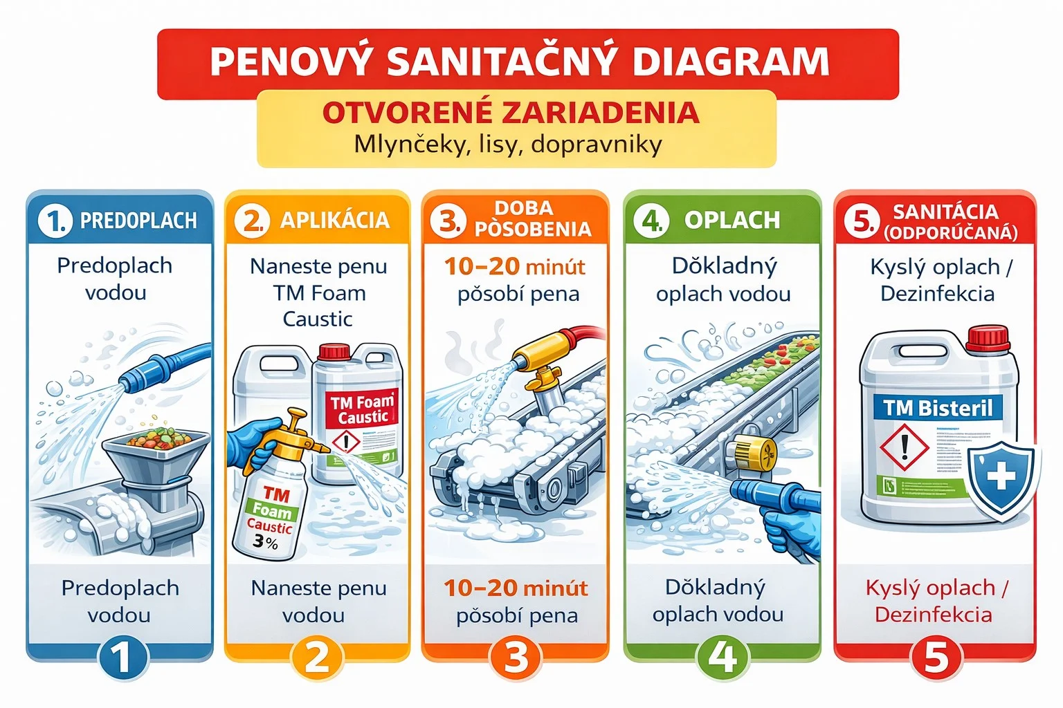Upozornenie: Keďže ide o silne alkalickú penu, dbajte na to, aby sa nedostala do kontaktu s citlivou elektronikou (ovládacie panely bez krytia) a hliníkovými štítkami strojov.